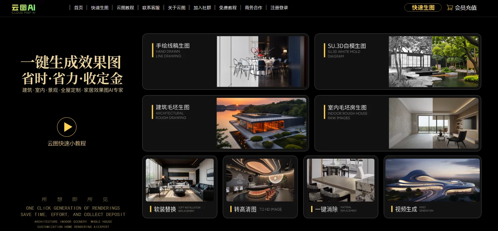 AI创意生成:用户只需上传线框图作为参考、选择目标类型与艺术风格、输入描述文字,即可快速批量创建效果图;这一功能不仅节省了设计师在方案构思阶段的时间,还能有效降低与客户的前期沟通成本。 彩平图生成:通过导入平面布局图并添加关键词描述,系统能自动生成多种风格的彩色平面图;这种可视化呈现方式能够显著提升设计方案的展示效果,让平面设计更加生动。 局部修改工具:设计师可以上传已有的效果图,并使用特定的重绘指令对指定区域进行快速调整;支持色彩替换、材质更换以及细节修改等操作。 凭借这三大核心功能,云图AI可全面覆盖:白膜图渲染、线稿图自动成图、实景图改造升级、彩平图多样化生成以及效果图衍生设计等全流程需求
