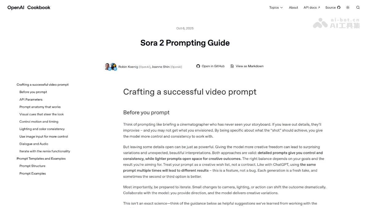 OpenAI推出的Sora 2提示词指南,能帮助用户更好地理解如何使用 Sora 2 进行有效的提示和交互。通过提供具体的提示技巧和示例,指导用户如何构建更有效的输入,获得更准确、更符合需求的输出结果。对于开发者和使用者,是非常实用的参考资源,能提升与 Sora 2 交互的效率和质量。