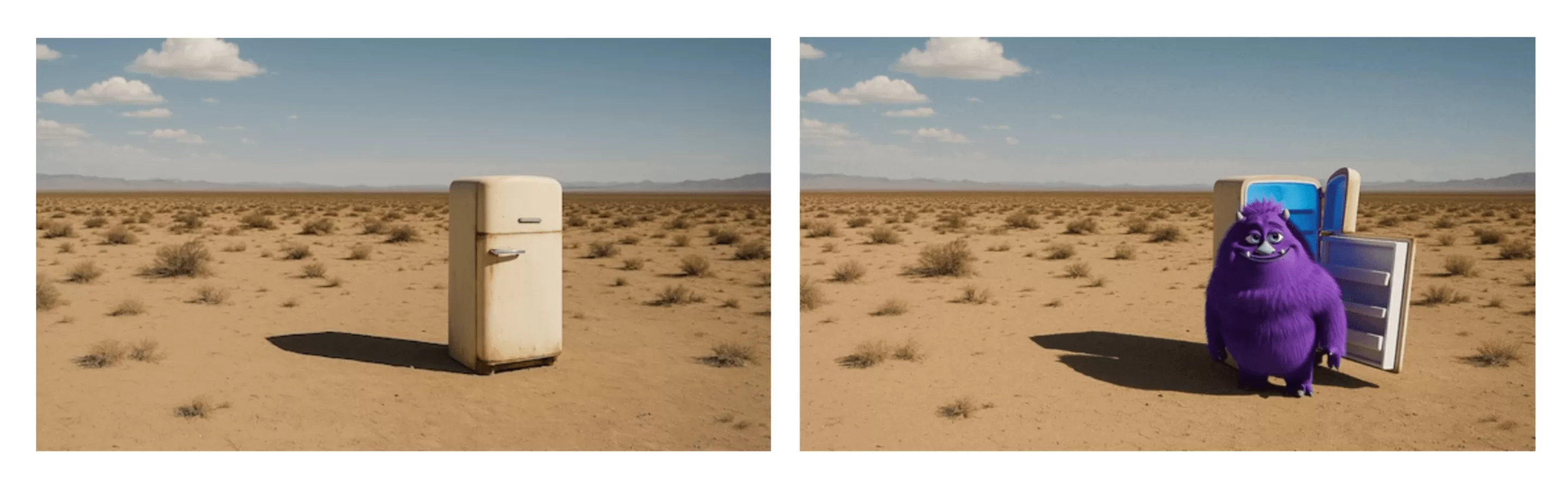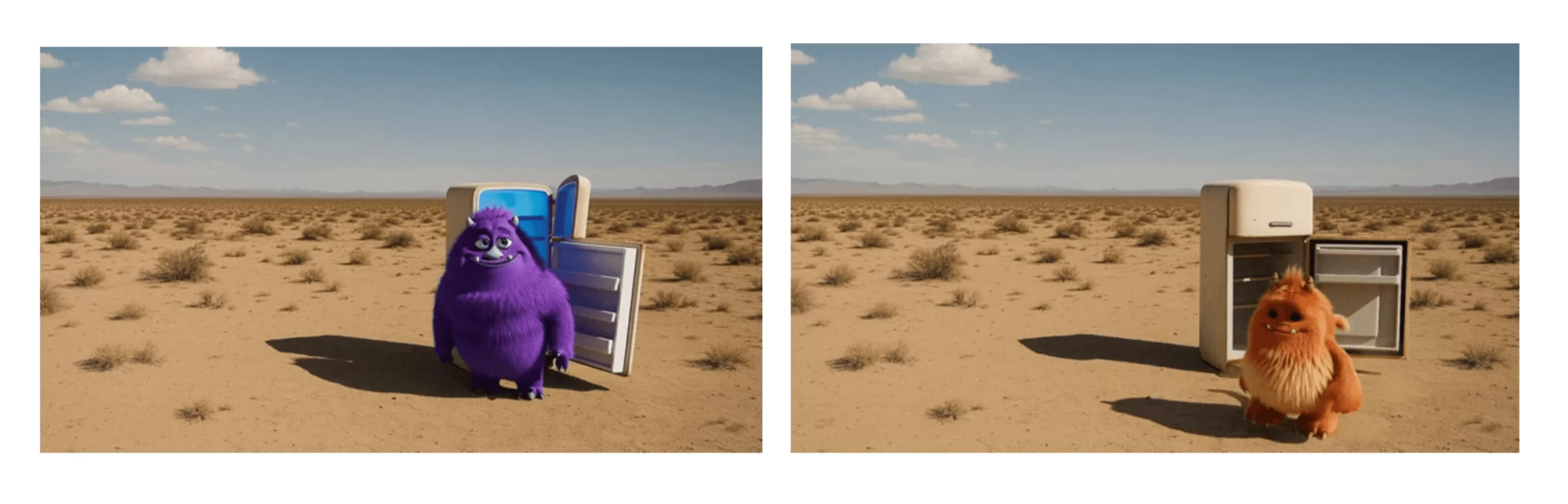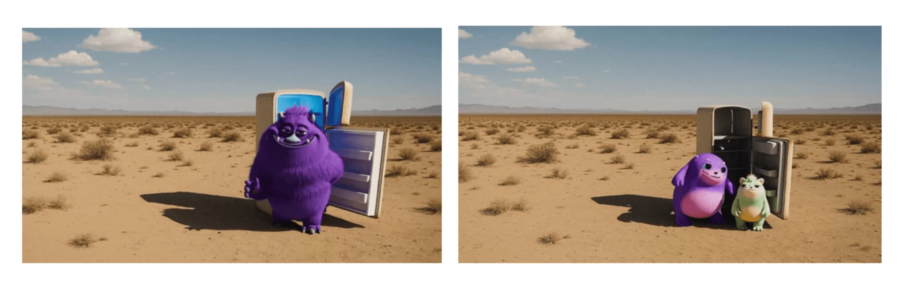 提示词:“The fridge door opens. A cute, chubby purple monster comes out of it.”(“冰箱门打开了。一个可爱、胖乎乎的紫色怪物从里面出来。”)